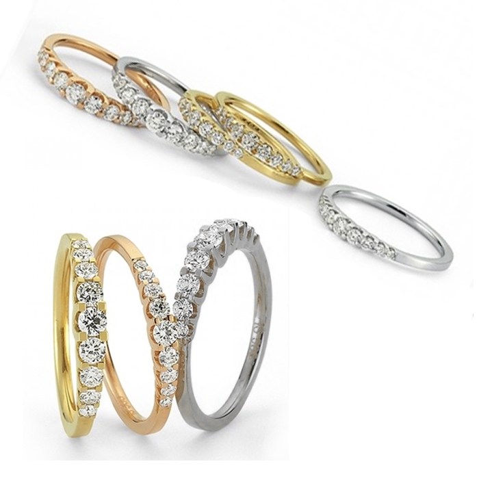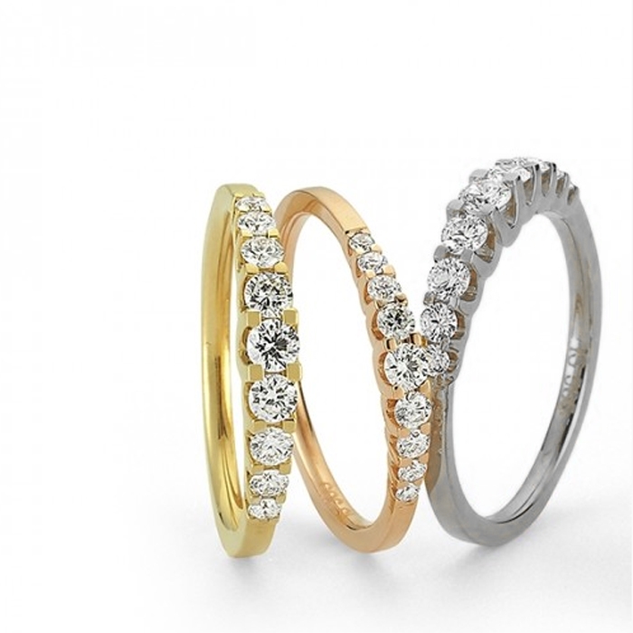 Red gold Alliance rings from Nuran with 9 diamonds in prong, available with a total of 0,24 ct - 0,43 ct - 0,50 ct 0,75 ct and 1,00 ct Wesselton / SI. These wedding rings from Nuran's Empire series, where from the side they look like the sparkling dimonds are floating, are available in both red gold, white gold and rose gold plated.