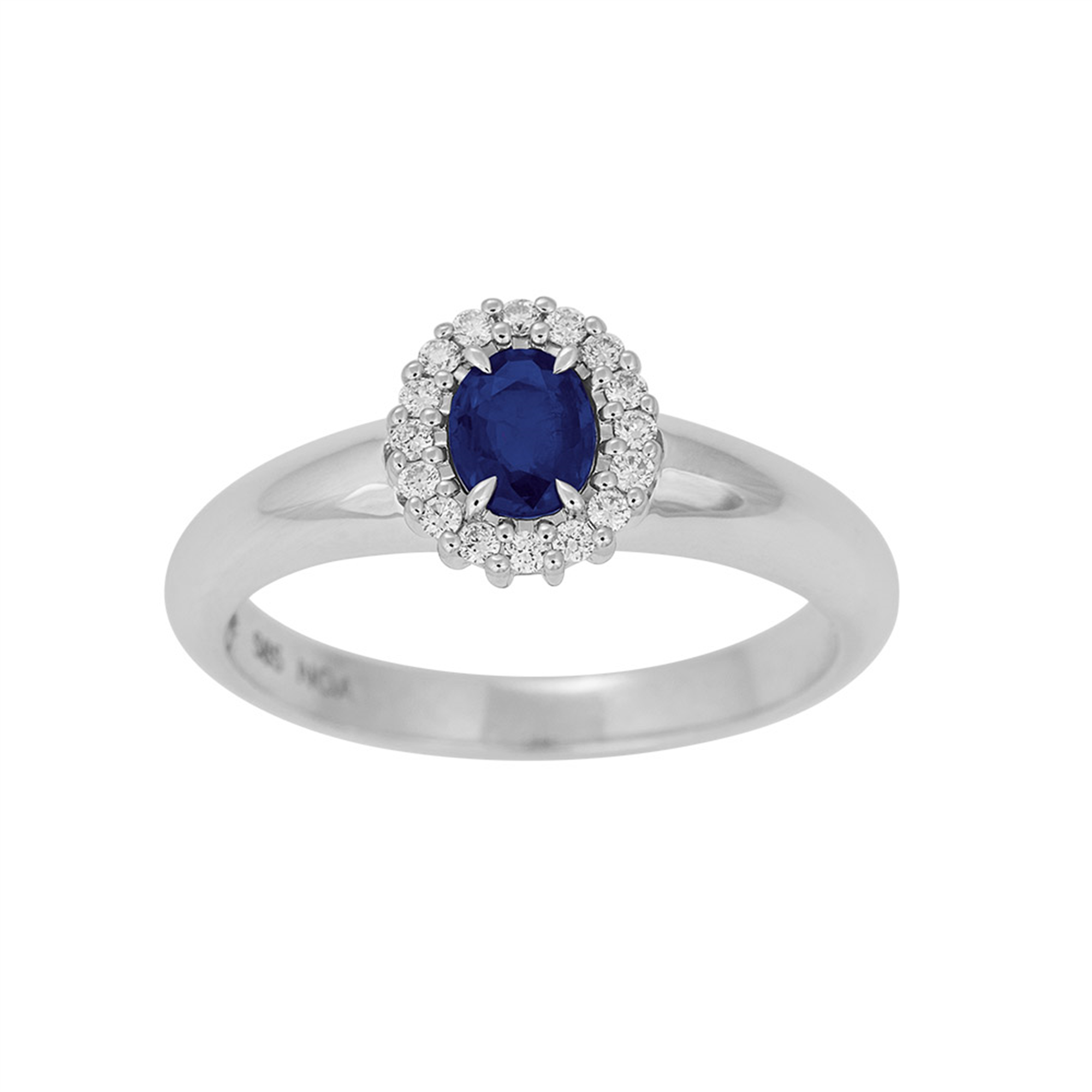 14 kt. guldring m/safir og dia 0.11ct W/SI, från Siersbøl