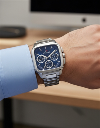 Tommy Hilfiger Herald Quartz är en distinkt klocka där det robusta metallarmbandet ger ett premiumintryck som passar både avslappnade och formella tillfällen. Den djupblå urtavlan skapar en elegant kontrast mot de vita visarna, medan den kvadratiska formen erbjuder ett unikt uttryck som skiljer sig från traditionella klockor.