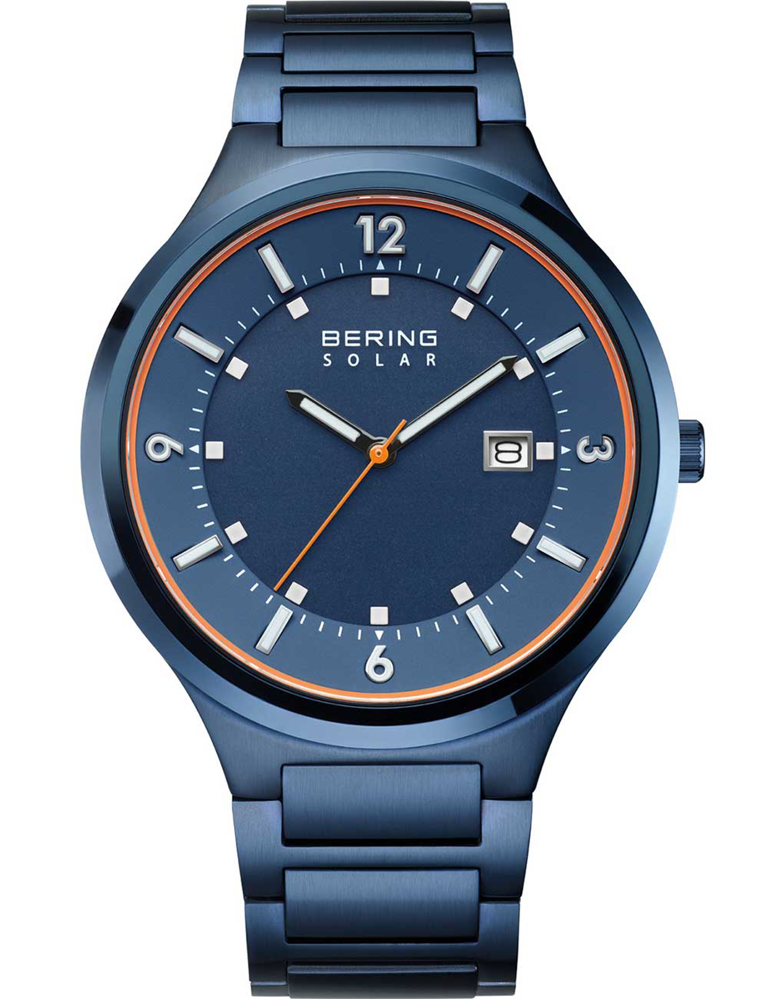 Blå urtavla med siffer- och linjemarkeringar, datum vid kl. 3, texten "BERING SOLAR".