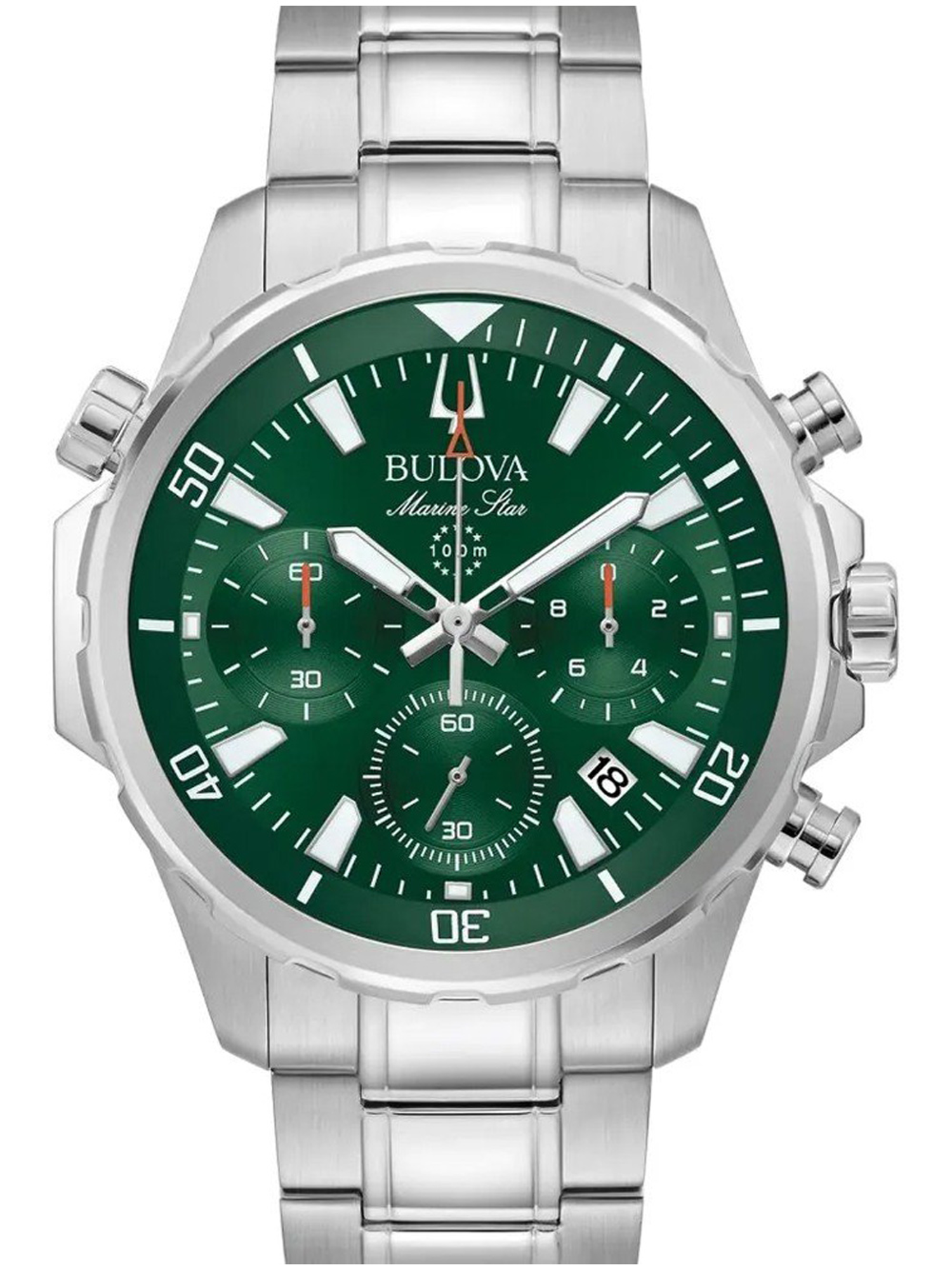 Grön urtavla, tre sub-urtavlor, text "Bulova", "Marine Star", "100m", metallarmband, märkta bezel.