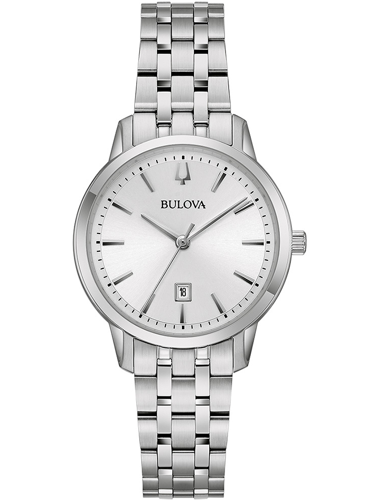 Silverfärgad Bulova damklocka med datumvisning vid 6, minimalistisk urtavla och länkarmband.