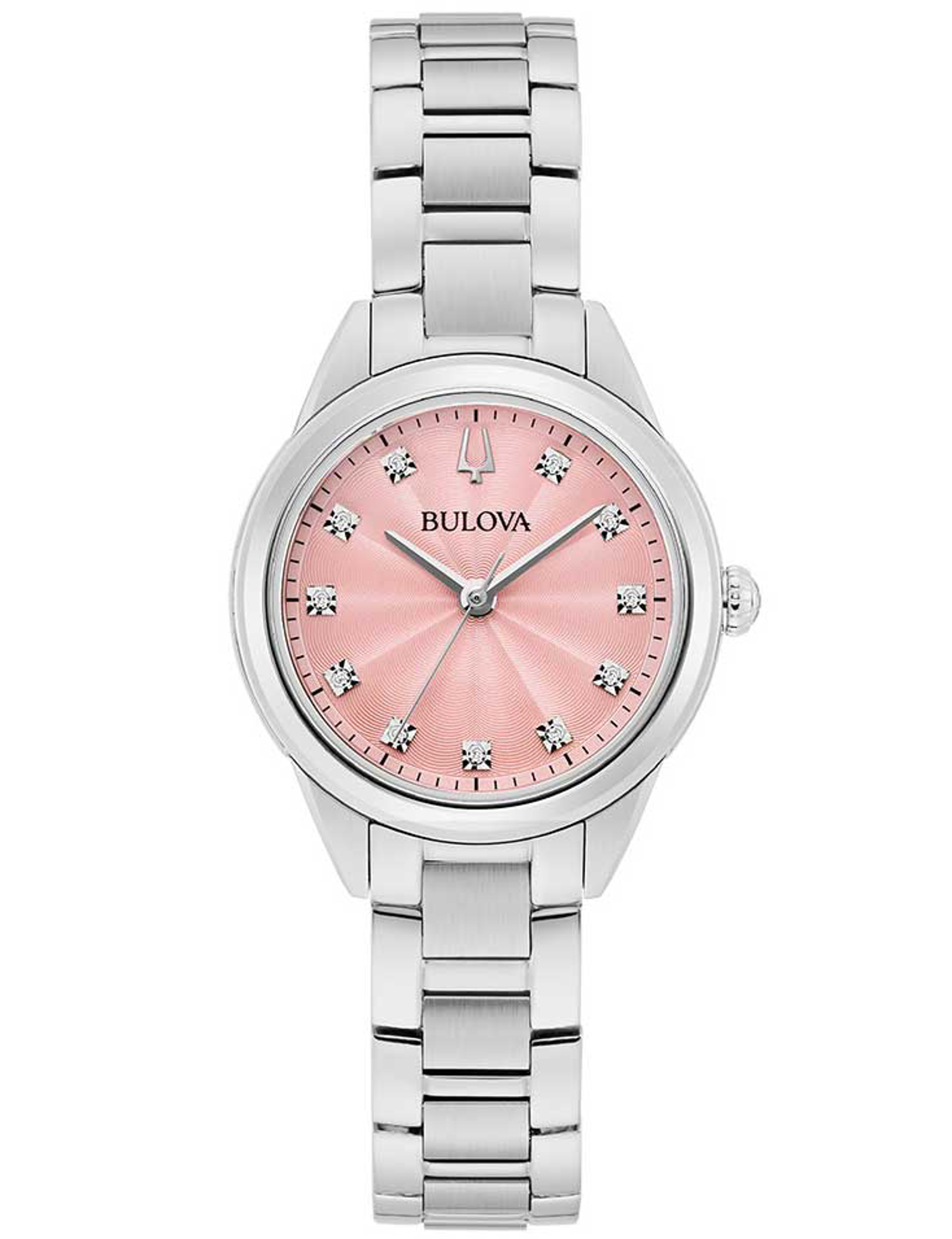 Klocka med rosa urtavla, silvermarkörer och armband. Elegant damklocka Bulova Sutton 28mm.