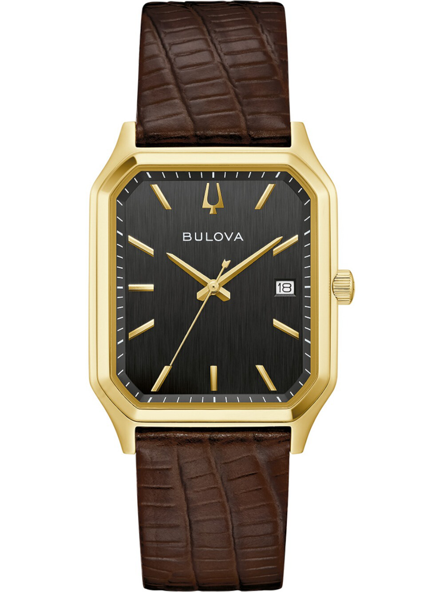 Med sin svarta urtavla och guldfärgade ram erbjuder denna 32 mm Bulova-klocka en distinkt stil för dig som uppskattar kvalitet. Den bruna texturerade remmen kompletterar den rektangulära boetten på ett utmärkt sätt.