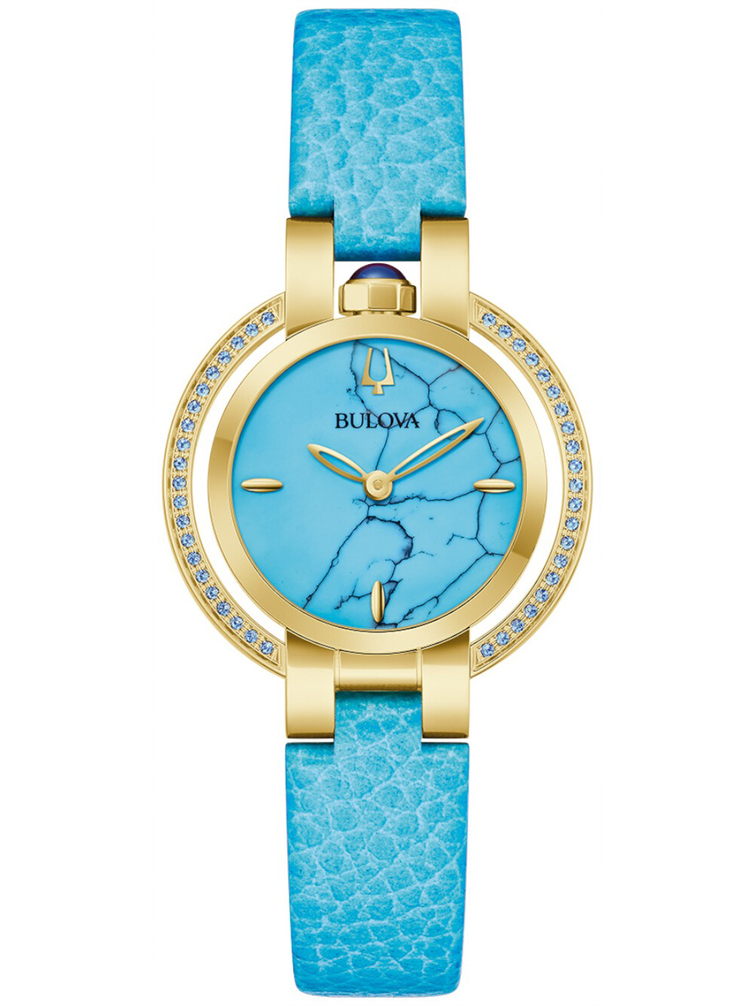 En damklocka från Bulova där den guldfärgade boetten pryds av infattade stenar. Med sin ljusblå urtavla och det texturerade armbandet blir klockan en följeslagare för både vardag och fest.