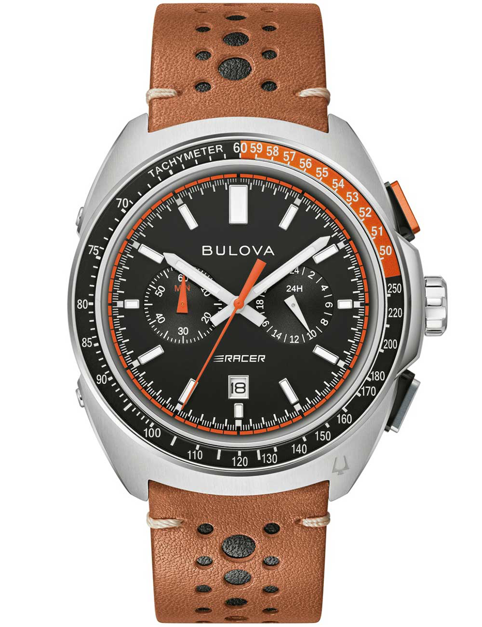 Bulova herrklocka med kronograf, tachymeter och brun perforerad rem.