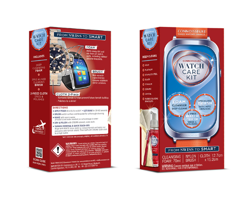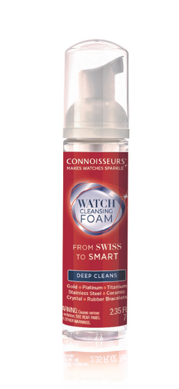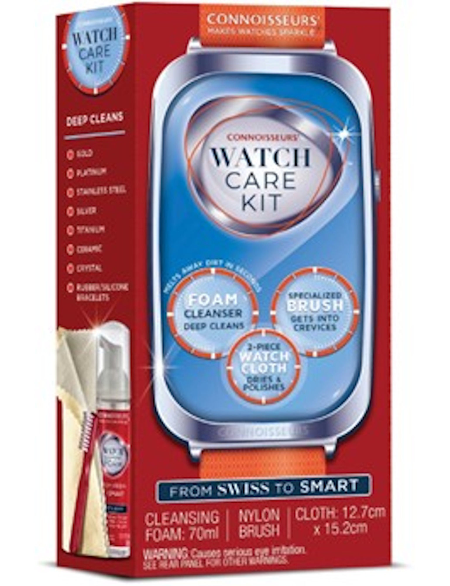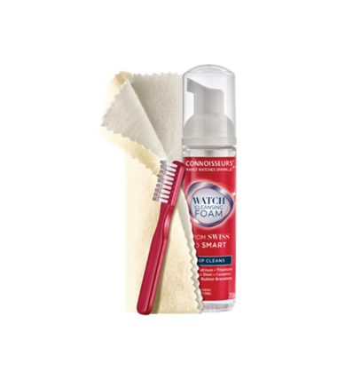 Från Schweiziska till Smarta! Ge nytt liv till din klocka och bibehåll dess glans med Connoisseurs nya 3-delars Klockvårdset som gör allt! Djuprengörande skum tar bort smuts och oljor från klockans skal och länkar på bara 30 sekunder. Använd den Specialiserade Nylonrengöringsborsten för att arbeta in rengöringsmedlet i små springor och ta bort envis smuts och smörja. Den tvådelade