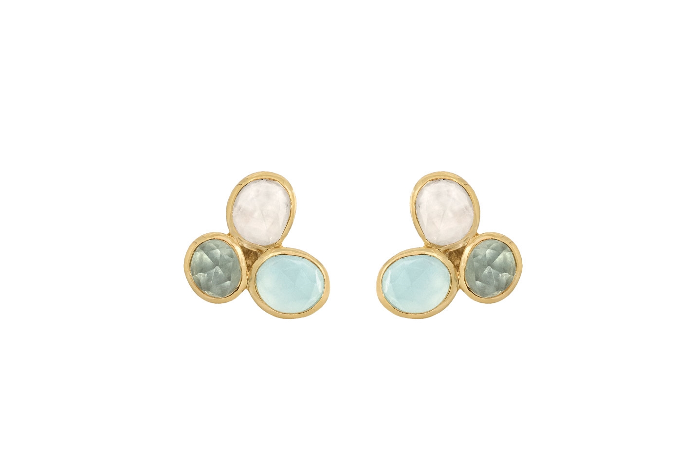 Dessa exklusiva örhängen från Rabinovich kombinerar äkta stenar i en harmonisk färgpalett av vit regnbågsmånsten, aqua blå kvarts och kalcedon. Den förgyllda sterlingsilverinfattningen ramar elegant in varje sten, vilket skapar en utmärkt balans mellan lyxig finish och vardaglig bärbarhet.