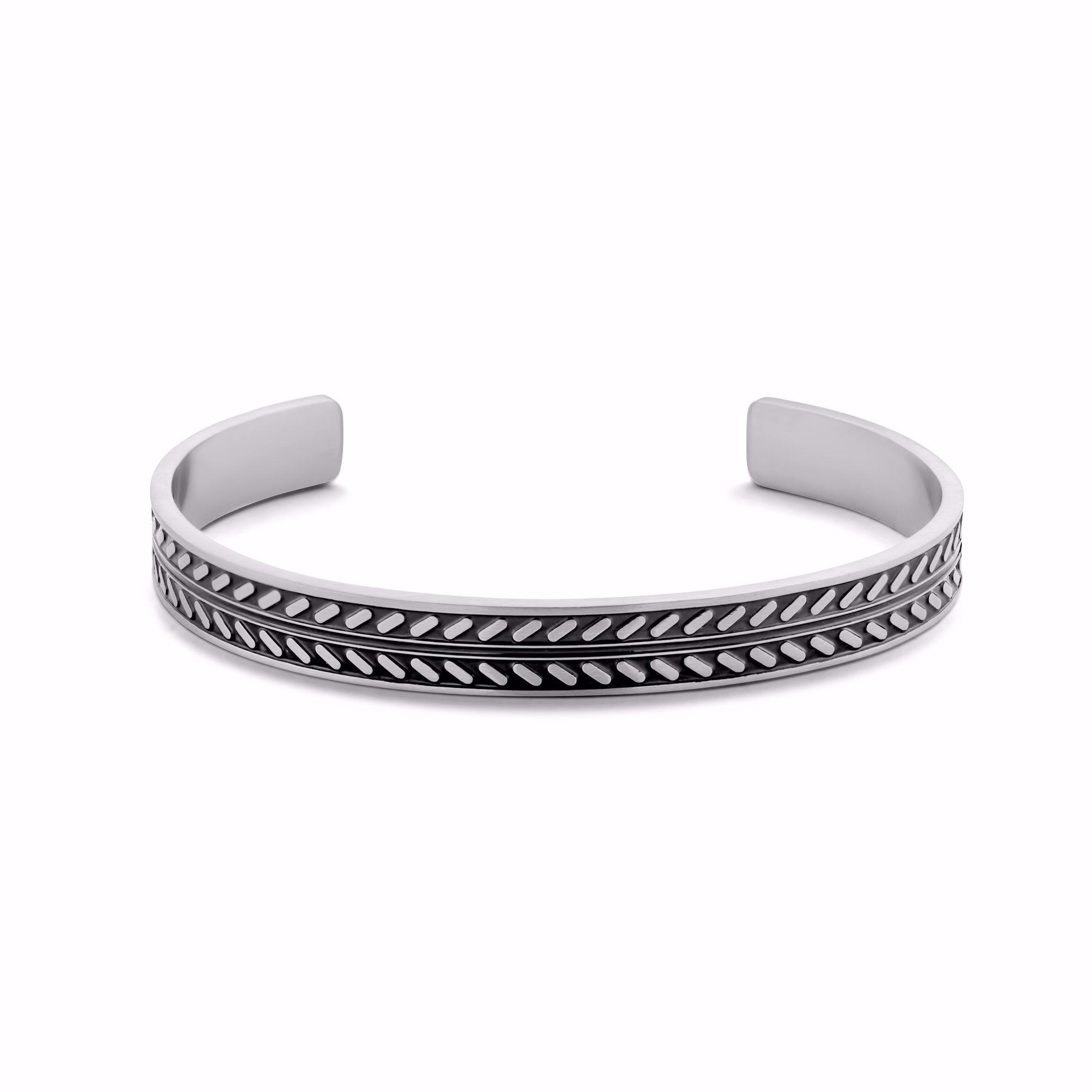 Öppen stålarmring med texturerat mönster och polerad yta. Elegant och stilren design.