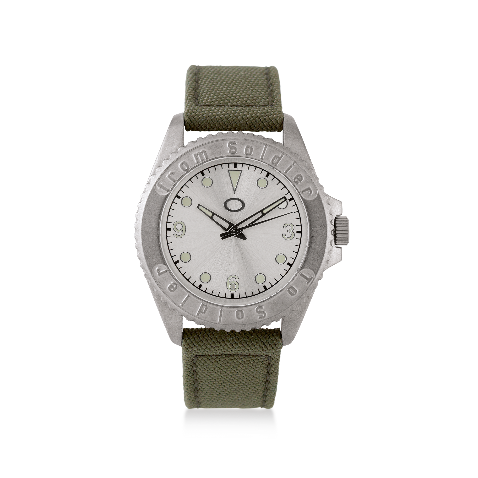 Grön canvasrem, metallboett med text "from soldier to soldier", vit urtavla med svarta markeringar.
