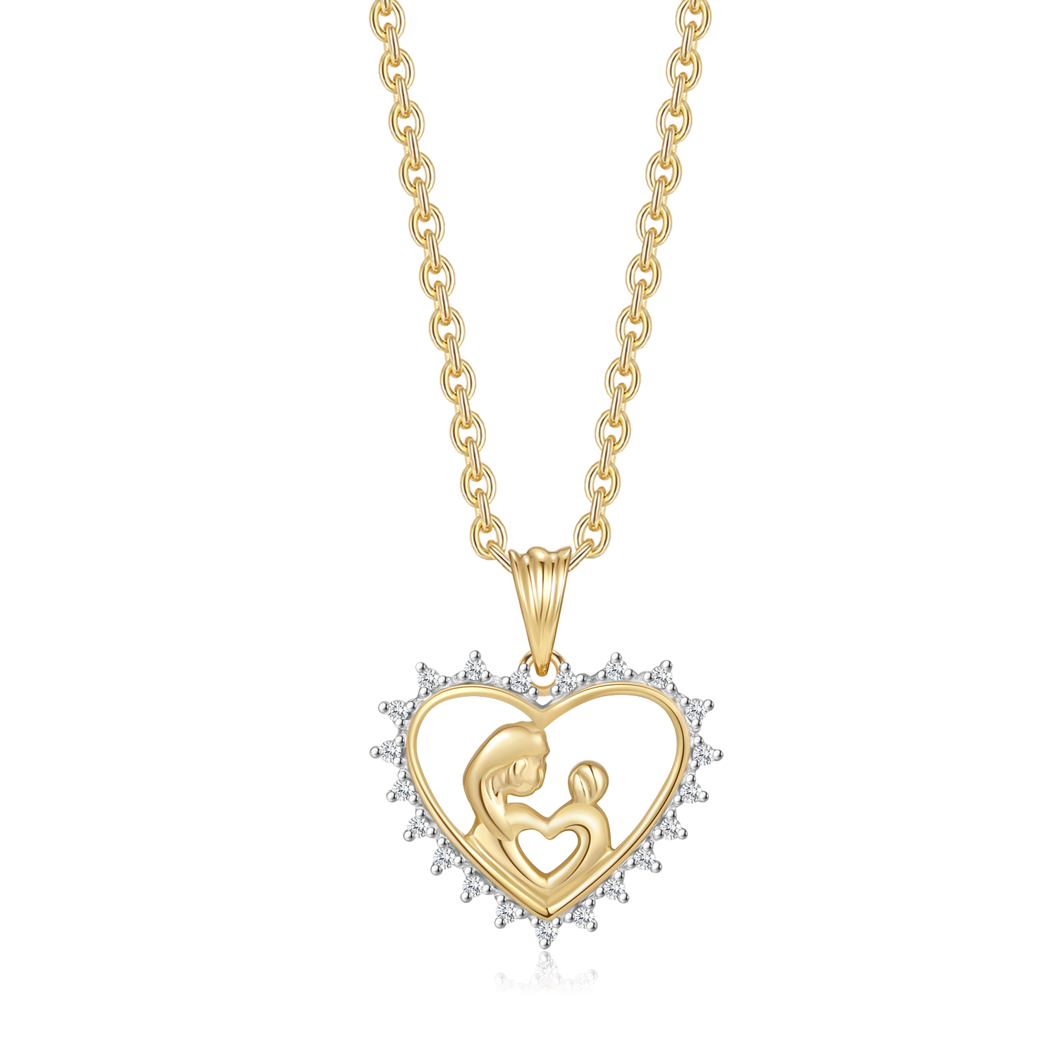 8 kt. guld vedhæng hjerte med mor og barn med syntetiske cubic zirconia rundt om.