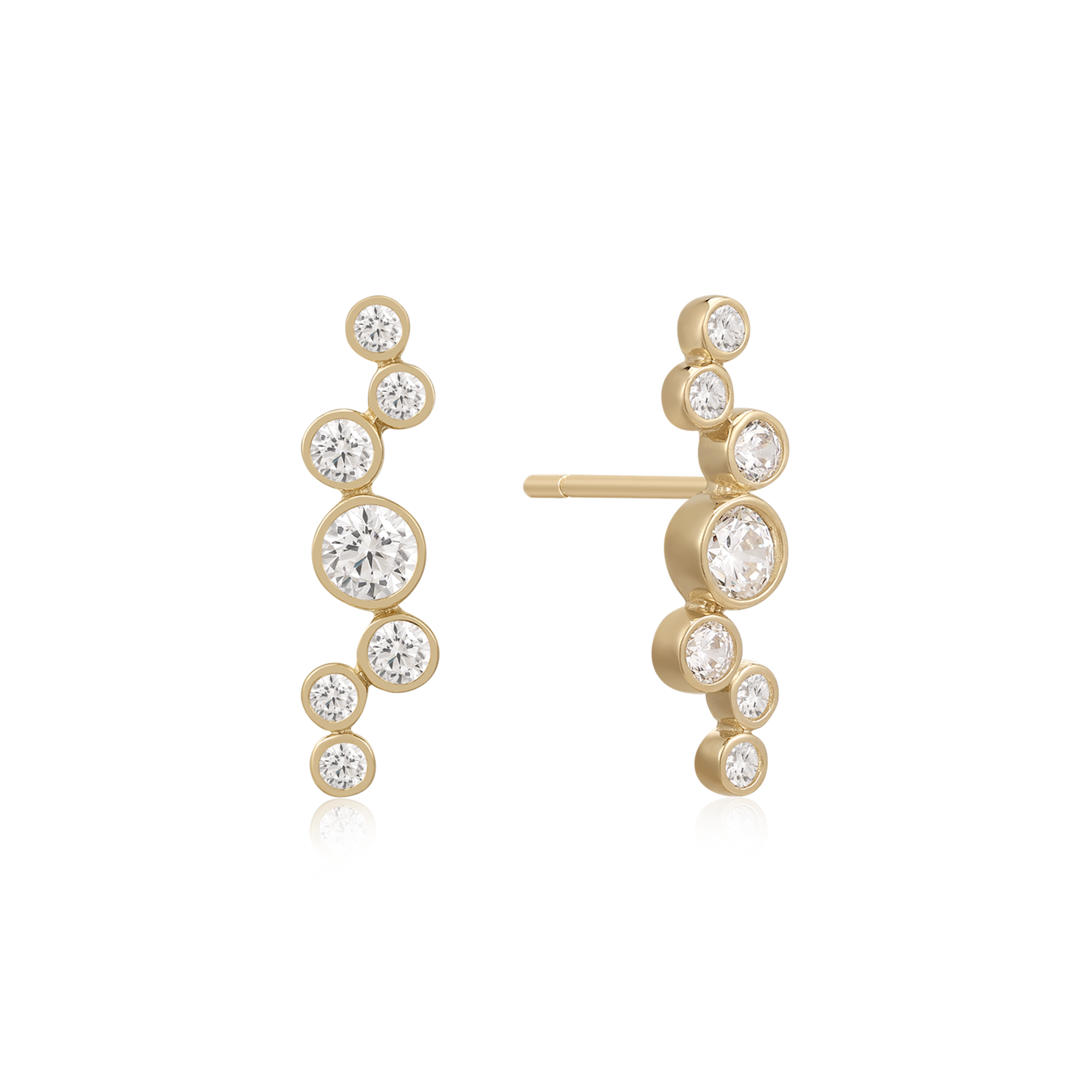 Den asymmetriska designen med kaskadeffekt och varierande stenstorlekar gör dessa örhängen från Støvring Design till ett sofistikerat val. Tillverkade i 8 kt guld med sju gnistrande cubic zirconia-stenar skapar de en dynamisk och modern look som drar blickarna till sig vid festliga tillställningar.