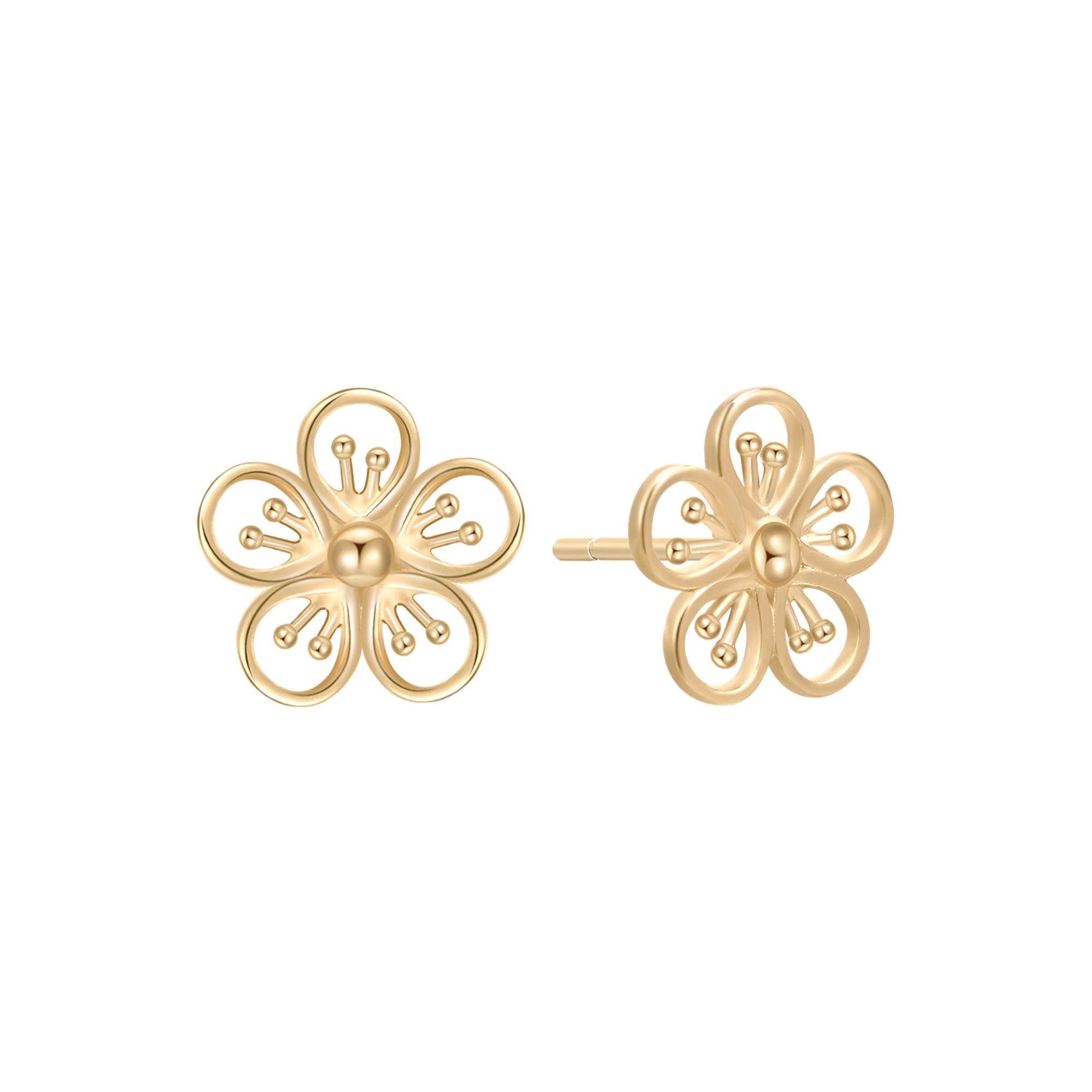 Guldörhängen med blomform, fem öppna kronblad och en glansig, polerad yta.