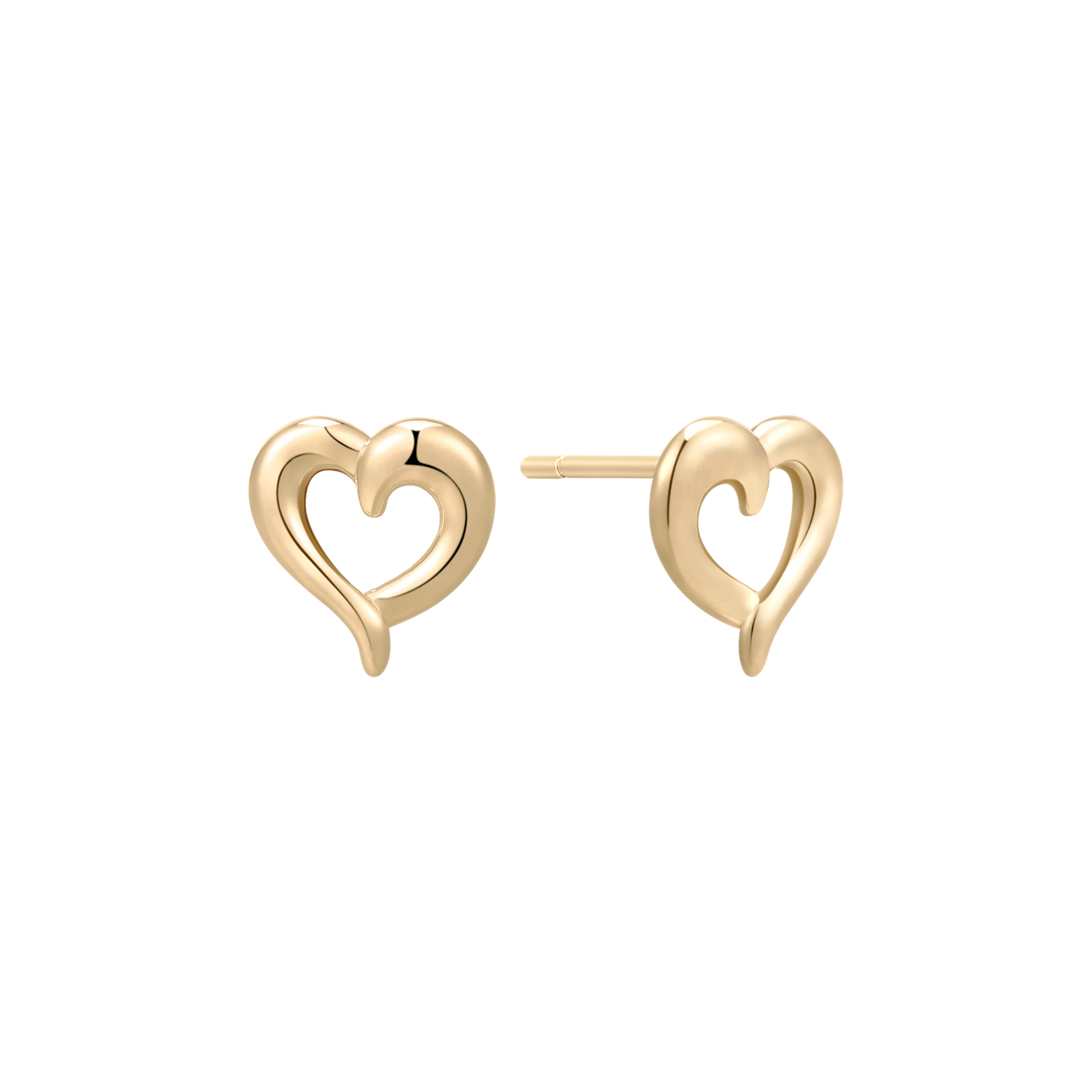 Hjärtformade, guldfärgade örhängen med slät yta och stift för genomborrade öron, Støvring Design.