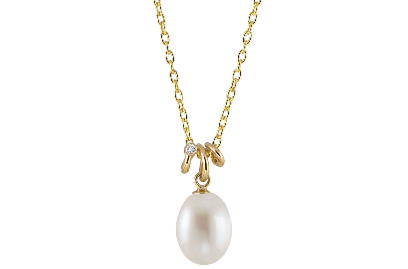 Detta exklusiva collier kombinerar 14 kt guld och förgyllt silver med en vacker sötvattenspärla och en gnistrande diamant. Den tidlösa kombinationen av pärla och diamant gör halsbandet ideal för bröllop och jubileum, medan den diskreta men eleganta designen passar utmärkt för fina restaurangbesök.
