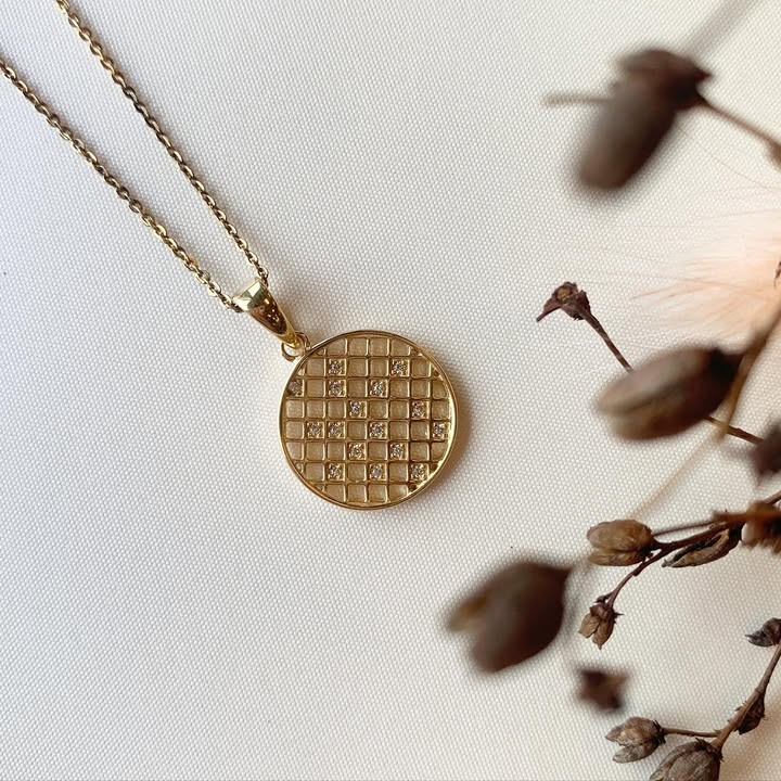 Beautiful pendant in silver plated with net pattern and sparkling zirconia