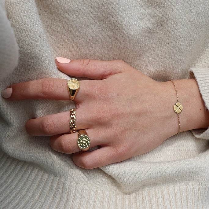 Signet finger ring in silver gilt with wavy surface. The ring comes with matching earrings, Ø 13 mm at the top.