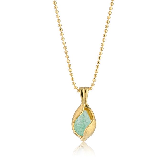Lille smykke æg i forgyldt sølv, Grøn aventurin - Blicher Fuglsang, med 45 cm kuglekæde