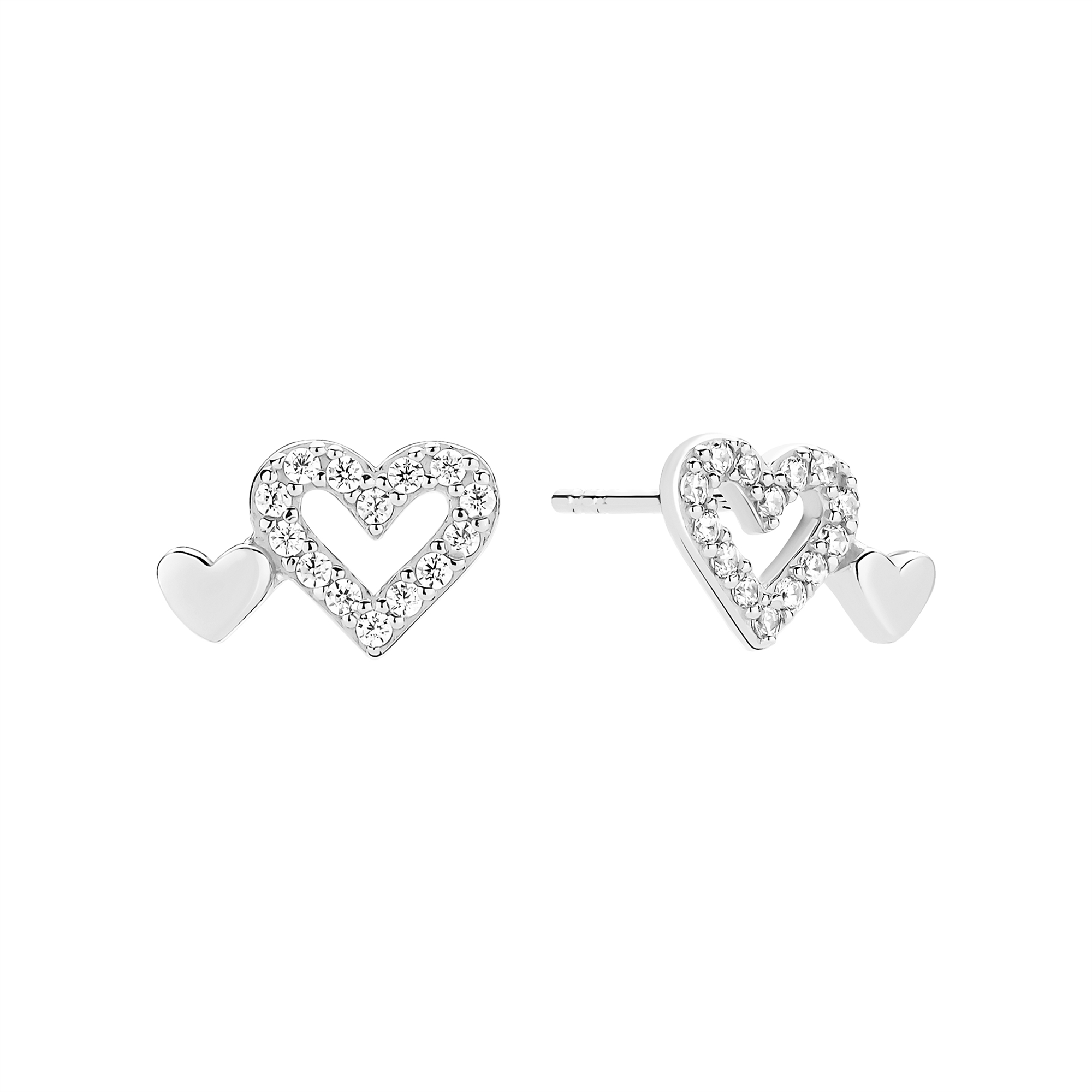 Örhängen med dubbla hjärtan: större hjärta med zirkonia, mindre solidt hjärta vid sidan.