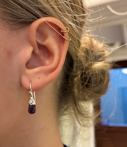 Örhängen med lila droppformad sten, dekorativ silverdel och liten rund sten upptill.
