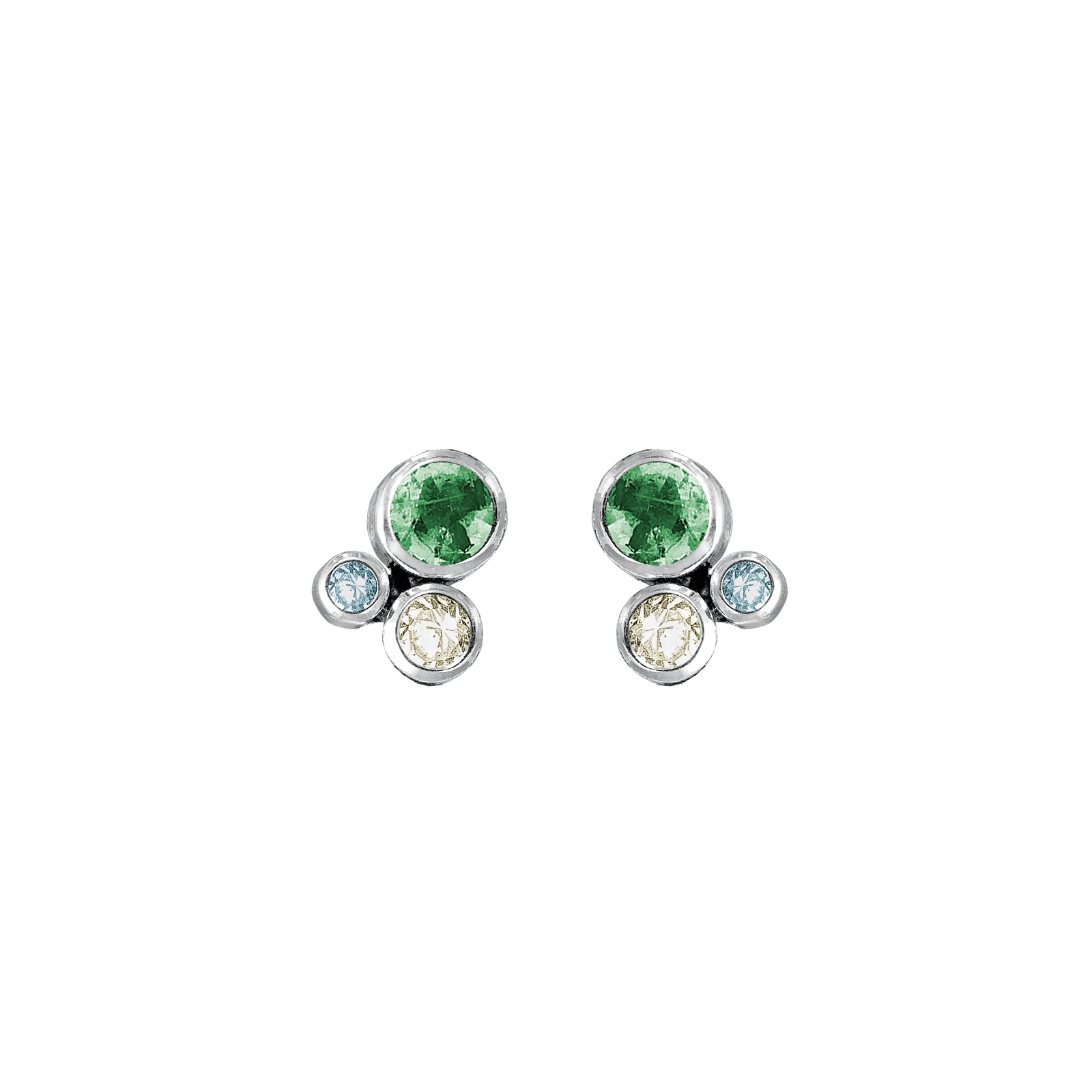 Dessa exklusiva örhängen i sterlingsilver presenterar en sofistikerad klusterdesign med tre noggrant utvalda ädelstenar. Den större apatiten på 4 mm utgör en iögonfallande fokuspunkt, medan prasiolit och topas i harmoniska toner skapar en utmärkt balans. Designen är idealisk för både vardaglig elegans och festliga tillfällen.