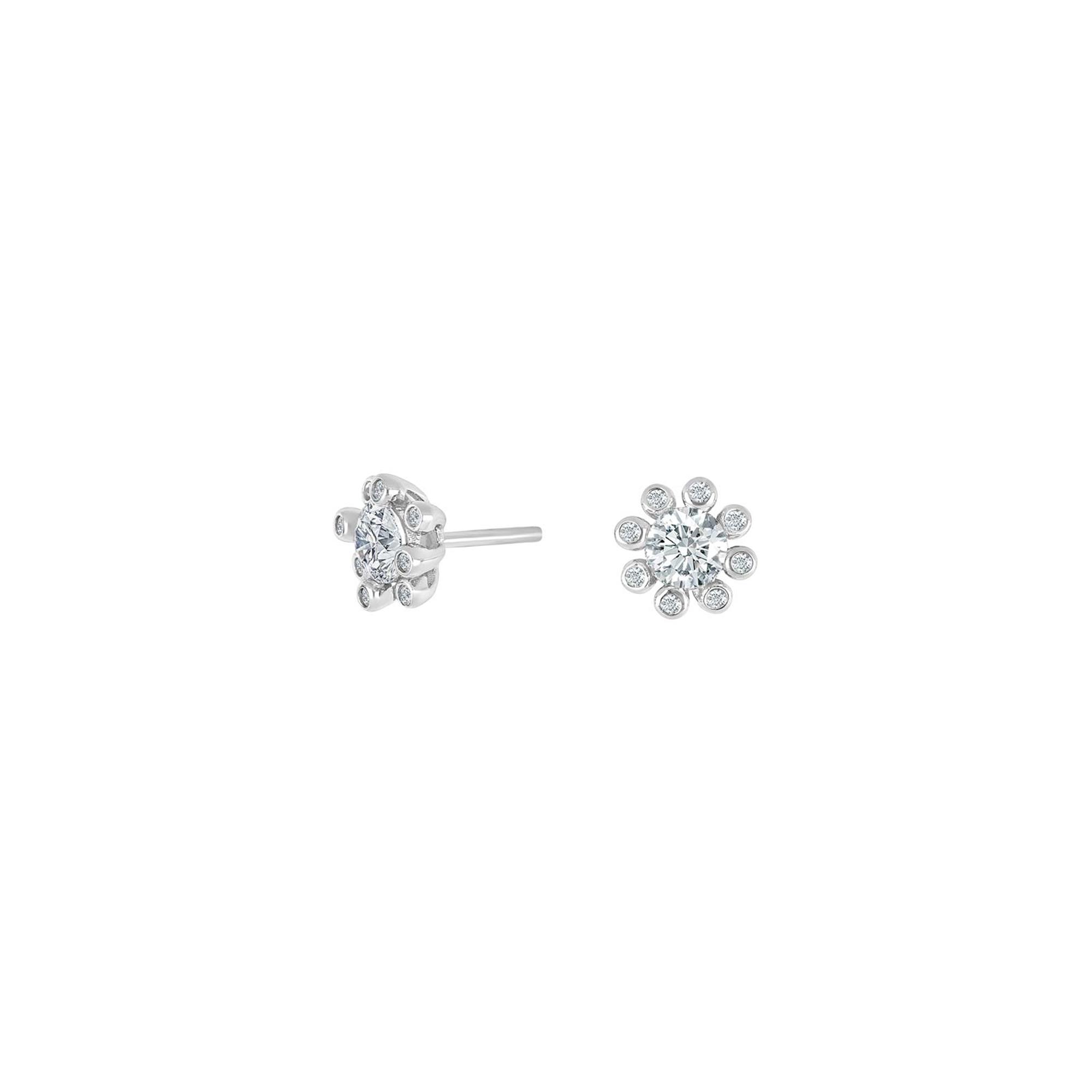 Smukke og tidløse øreringe med inspiration fra naturen. Øreringene har en stor kubisk zirkonia i midten, og rundt om er der otte små, forskudte sten. Tilsammen danner de glitrende sten den smukkeste blomst. Øreringene