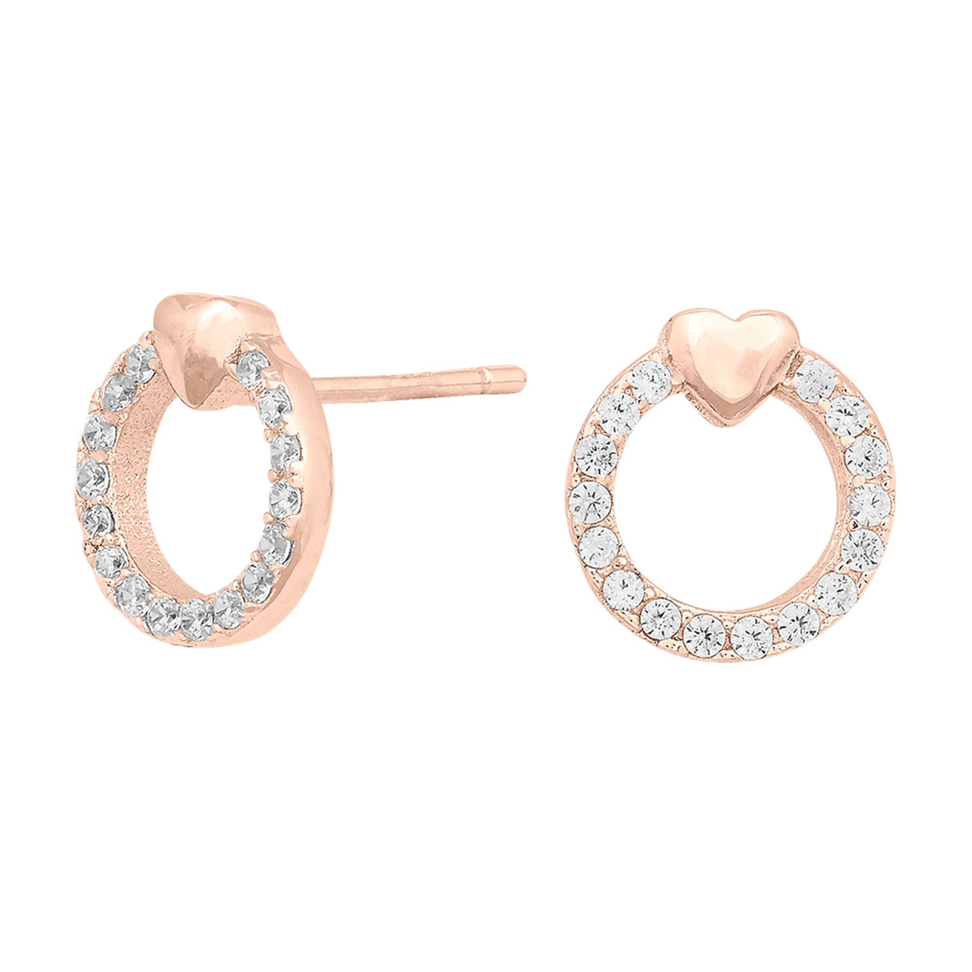 Flatterende, klassik designet smykke, med et lille twist! Med skinnende zirkonia sten, samt det diskrete, lille hjerte, er vores Brina øreringe en smuk version af de populære cirkulære øreringe. De rosaforgyldte sølvøreringe har et ubesværet og sødt ud