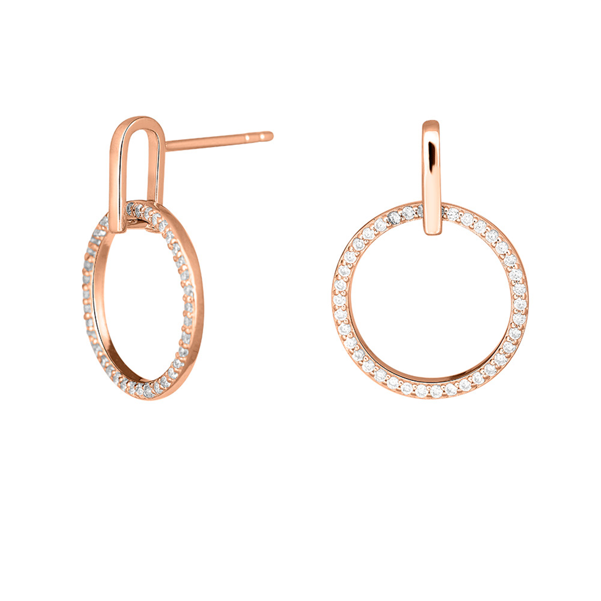 Elegante og glimtende ørehængere. De smukke ørehængere i rosaforgyldt sølv fra vores AnnaNor serie vækker opsigt og beundring. Den kubisk zirkonia besatte cirkel hænger bevægeligt i leddet, hvilket givet smykket bevægelse og liv, der rigtigt lader l