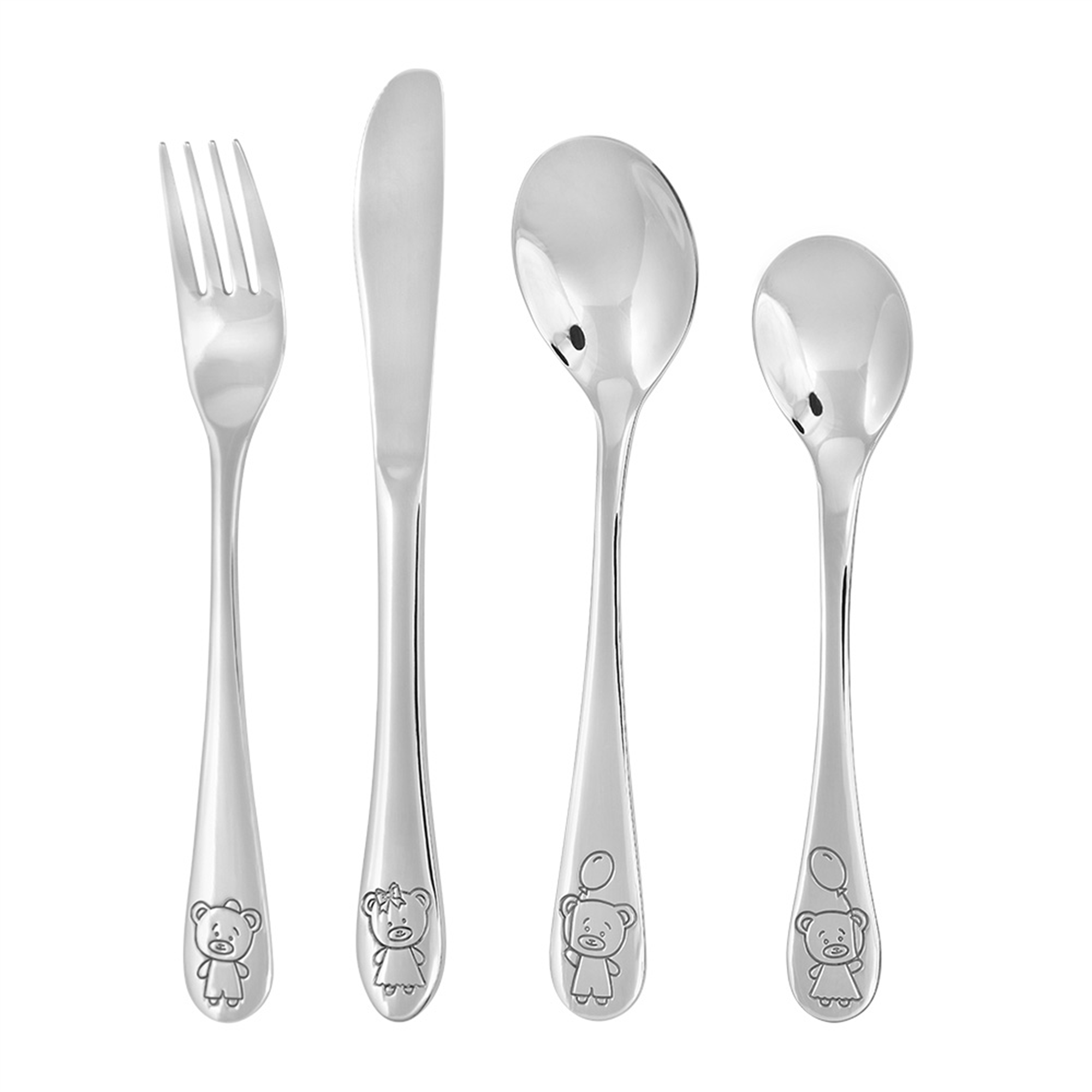 Unikt og sødt rustfrit børnebestik præget med fine små bamser. Sættet indeholder kniv, gaffel, spiseske og teske. Et rigtigt sødt og kært bestik til børn, som er oplagt som fødselsdagsgave, dåbsgave eller barselsgave. Barnet kan bruge bestikket til de
