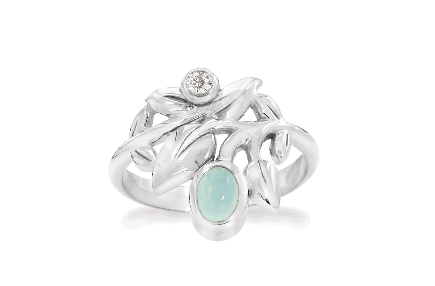 Ringens harmoniska design med den bleka kalcedonen och gnistrande zirkonian skapar en utmärkt balans. Den fungerar lika bra som ett statement-smycke vid speciella tillfällen som ett vardagligt accessoar som adderar en touch av elegans till din personliga stil.