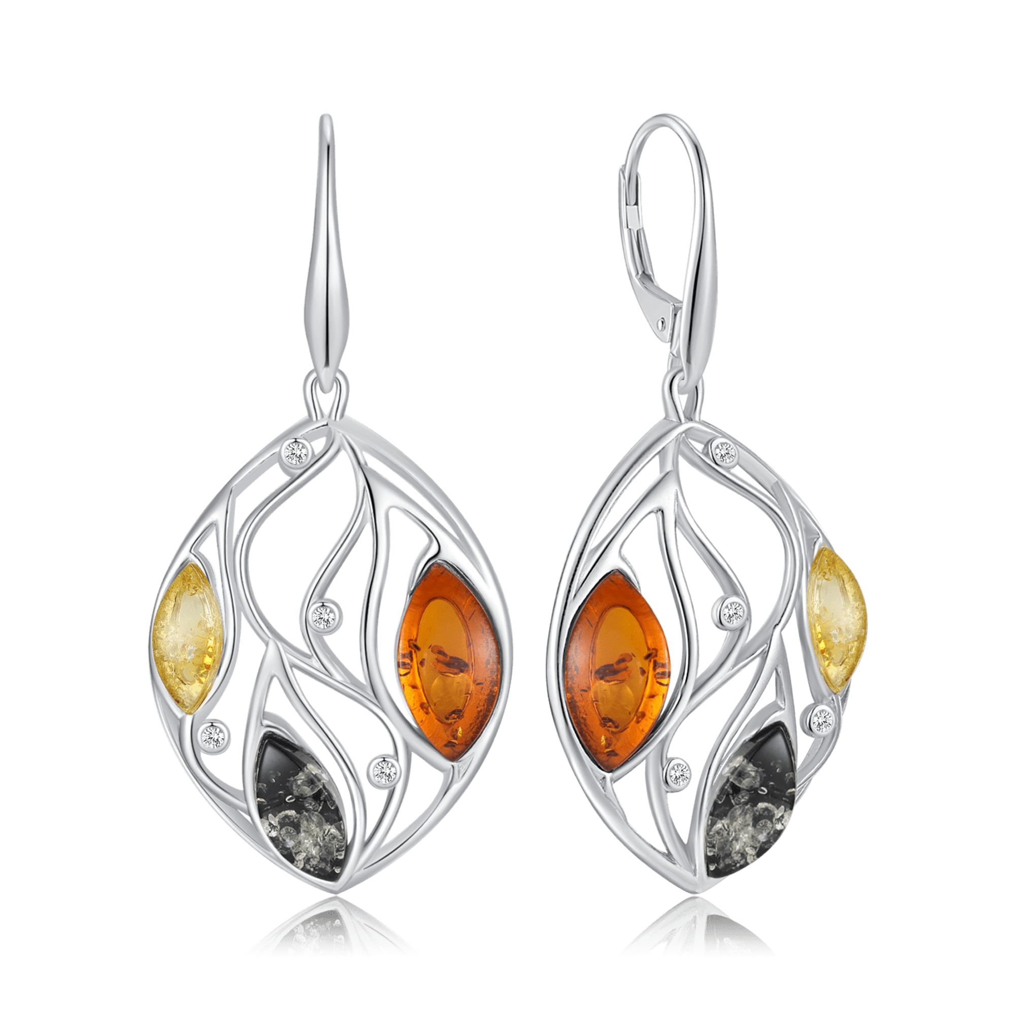 Sølv ørehænger rhodineret dråbe med 3 forskellige rav - Lemon,rav, sort agat og syntetiske cubic zirconia.