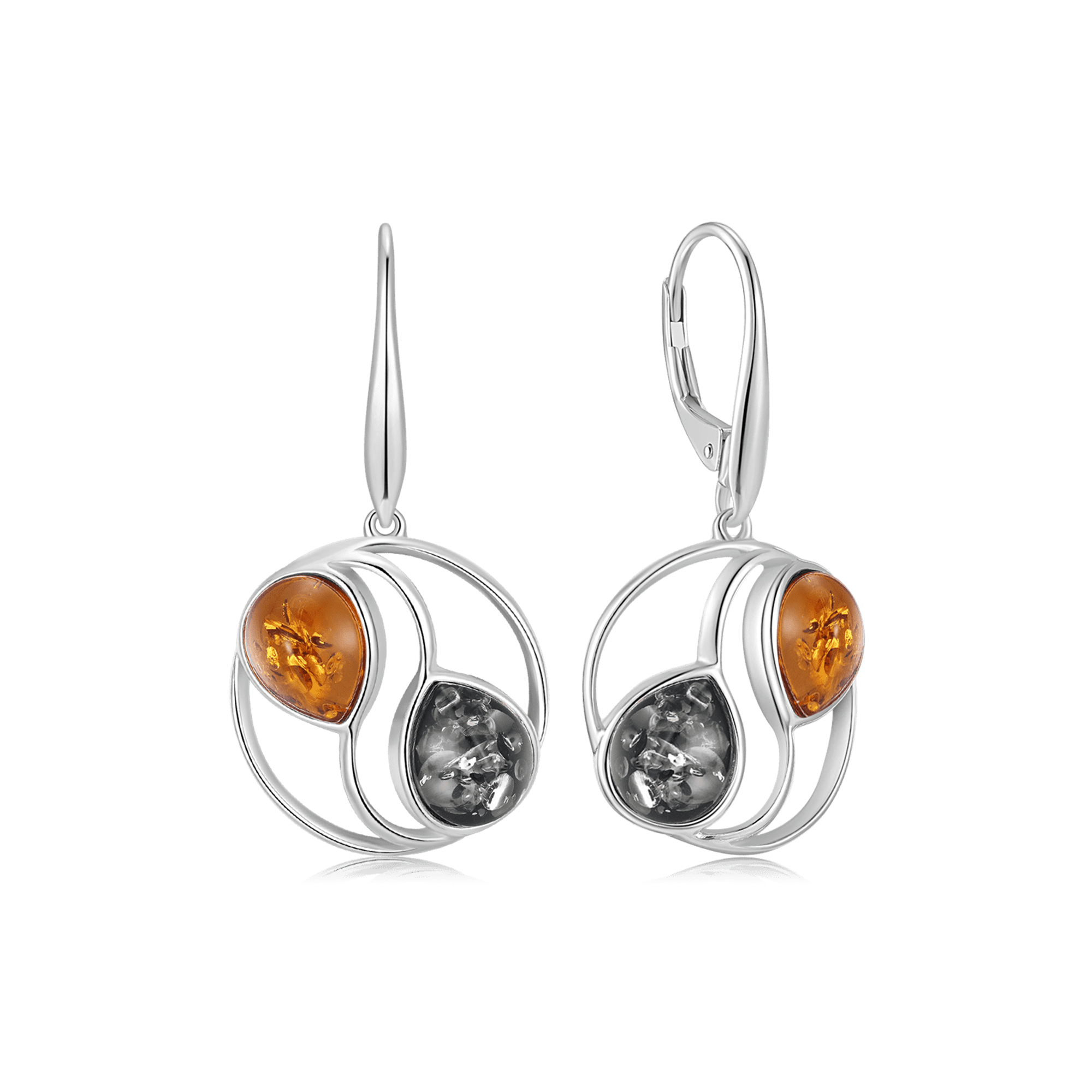 Sølv ørehænger rhodineret cirkel med 2 forskellige rav- sort agat og rav.