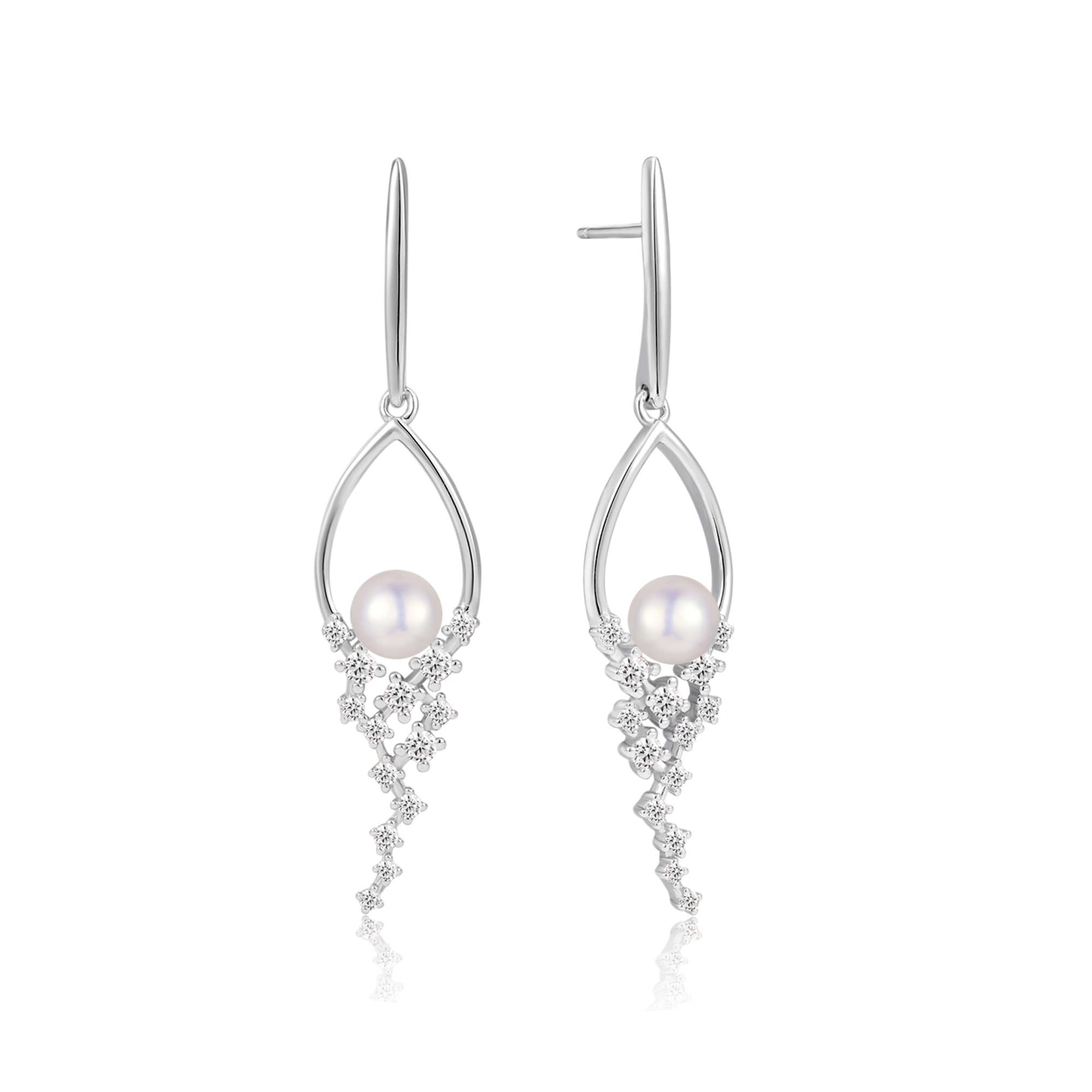 Sølv ørehænger rhodineret pind med oval i bunden dråber med syntetiske cubic zirconia og ferskvandsperle i midten.