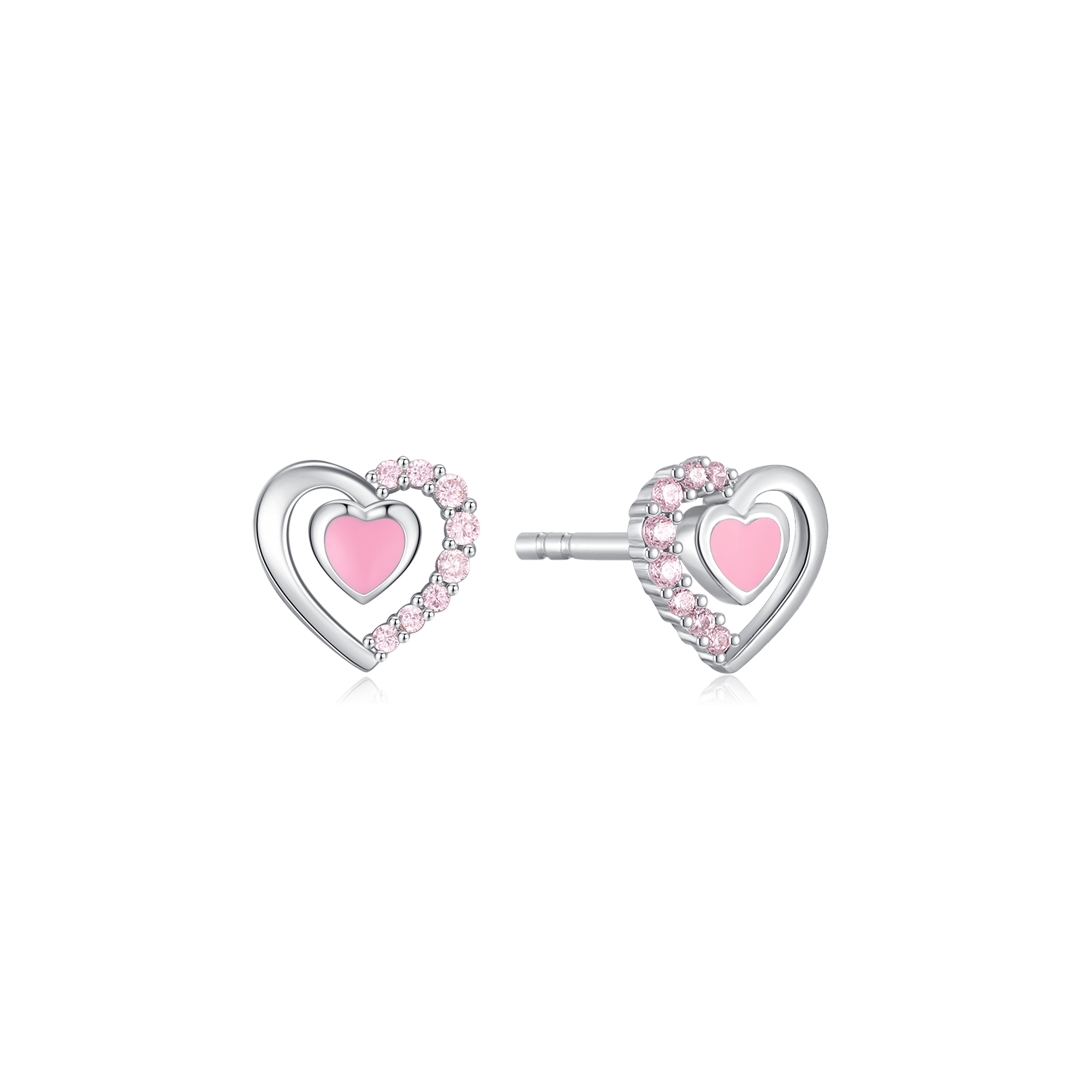Sølv ørestikker rhodineret hjerte med lyserød blyfri emalje hjerte med syntetiske cubic zirconia.