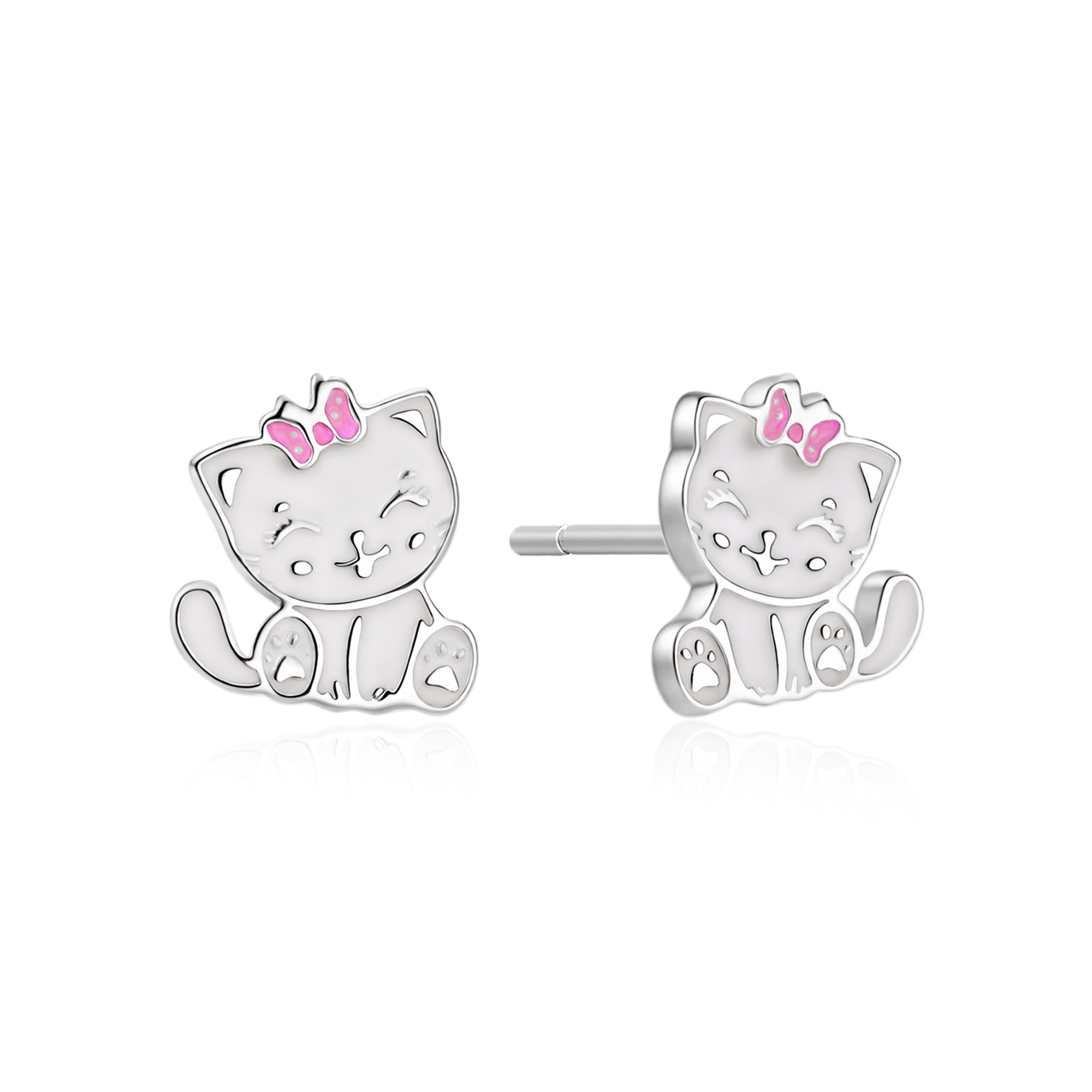 Sølv ørestikker kat i hvid med ryserød sløjfe blyfri emalje.