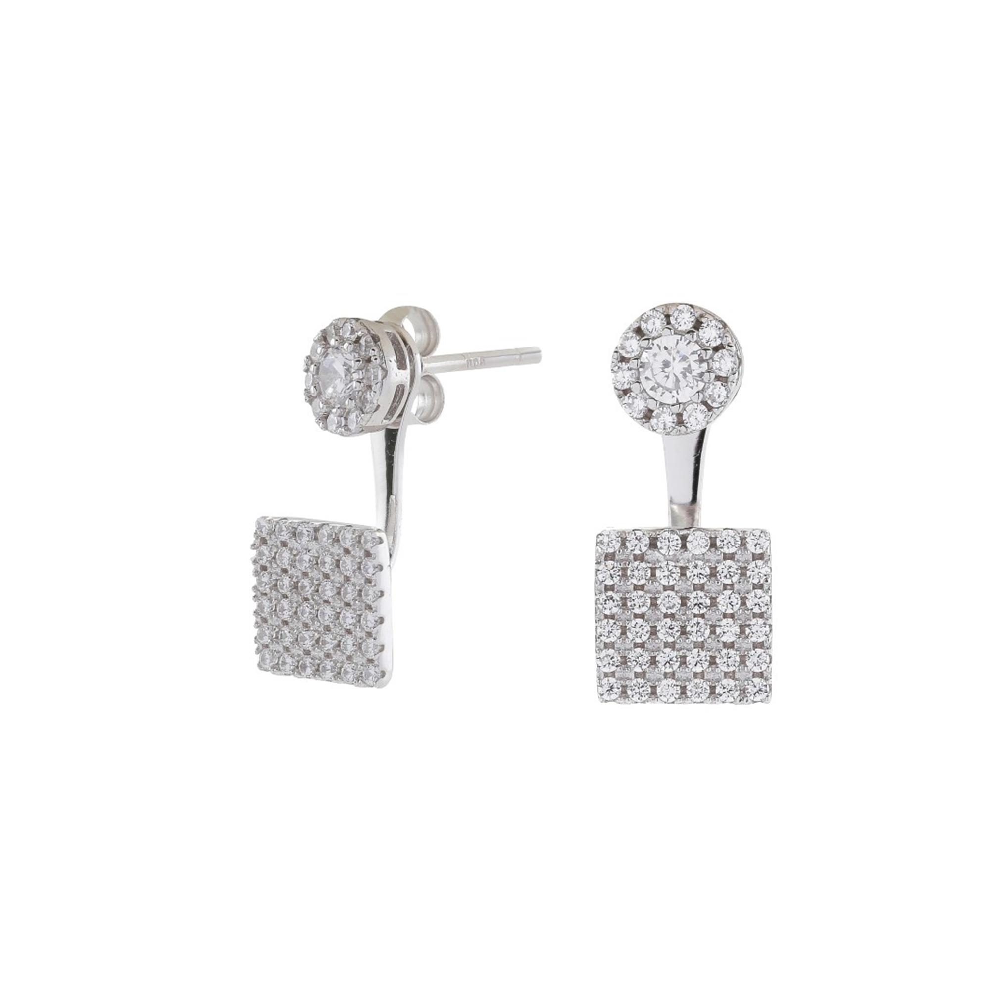 Smukke ørestikker, med funklende sten! Disse fine og klassiske øreringe, i rhodineret sølv, fra vores Alaine serie, er et stilsikkert valg. Øreringene har en lille cirkel i toppen, og en firkant nederst – begge besat med zirkonia sten i høj kvalitet. B