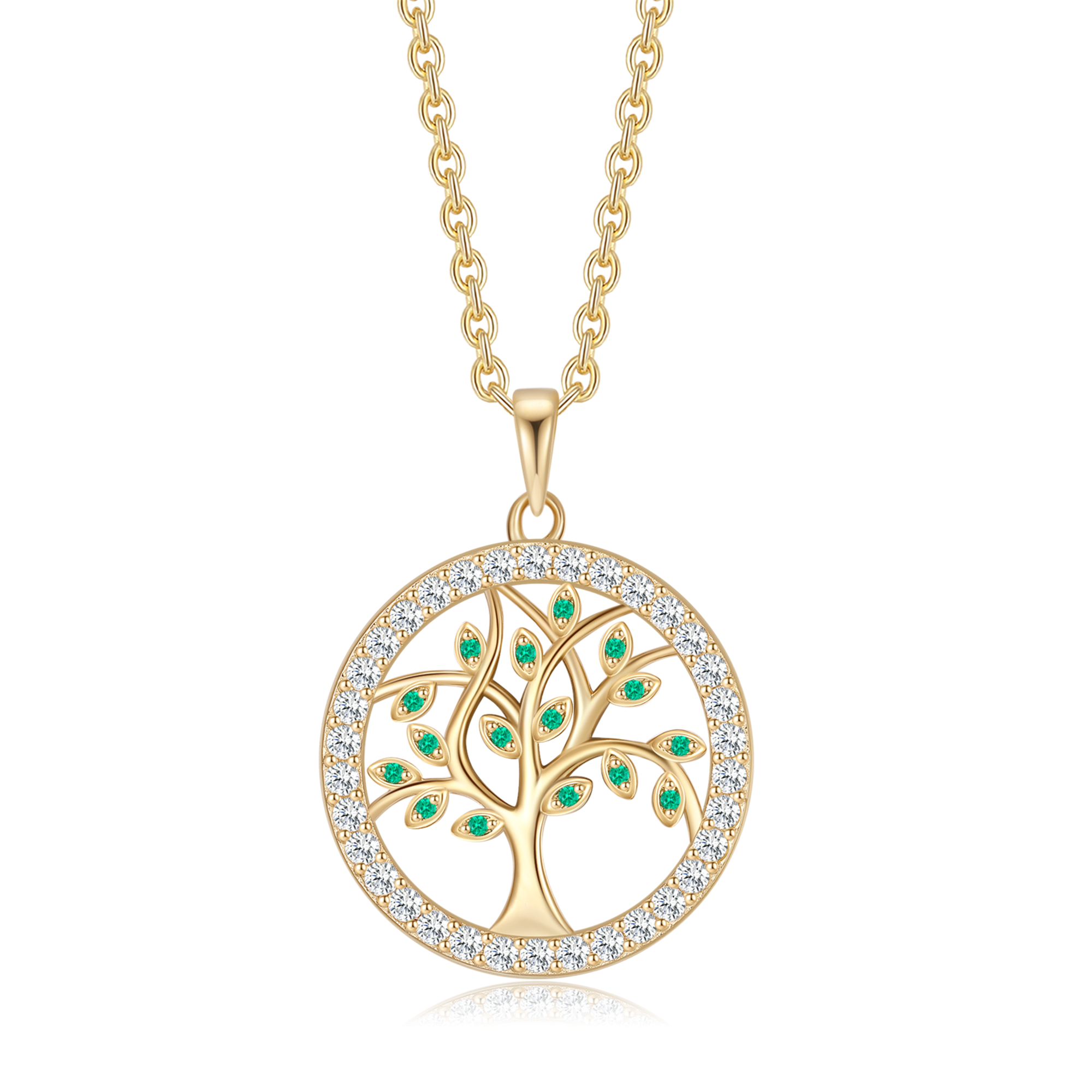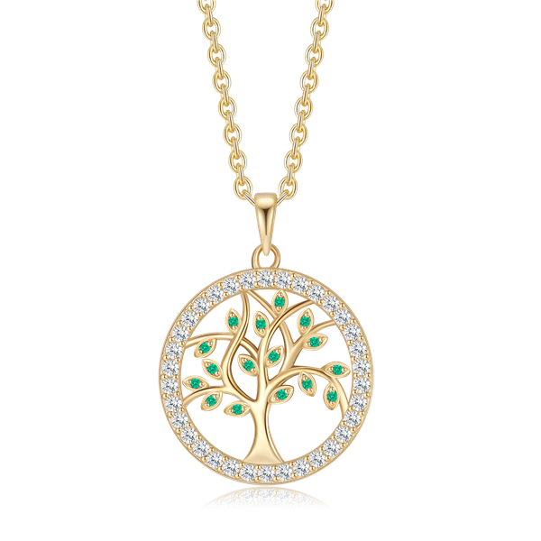 Sølvforgyldt halskæde livets træ i cirkel med syntetiske cubic zirconia og i grøn farve på blade.