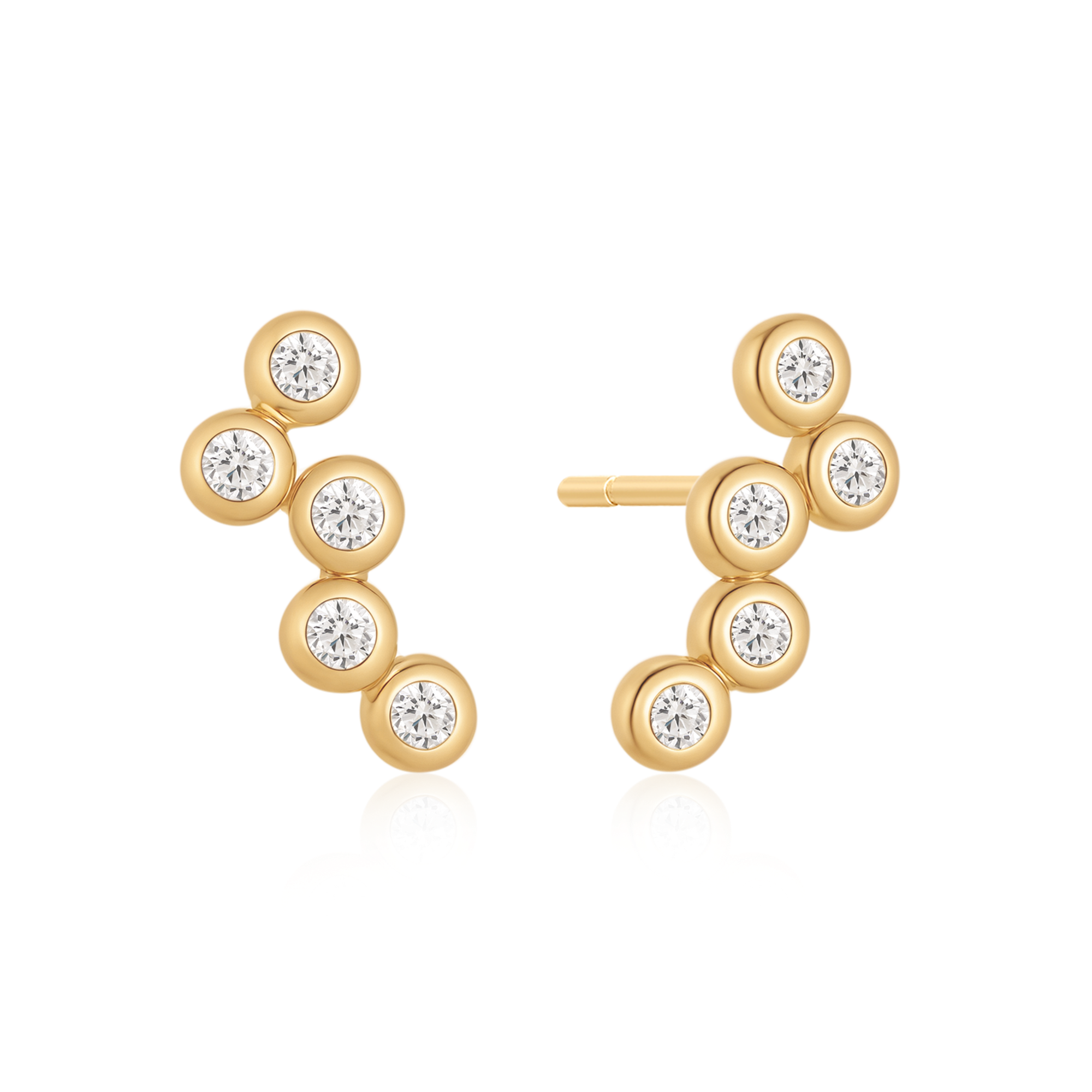 Guldfärgade örhängen med fem cirkulära element, varje med en klar sten.