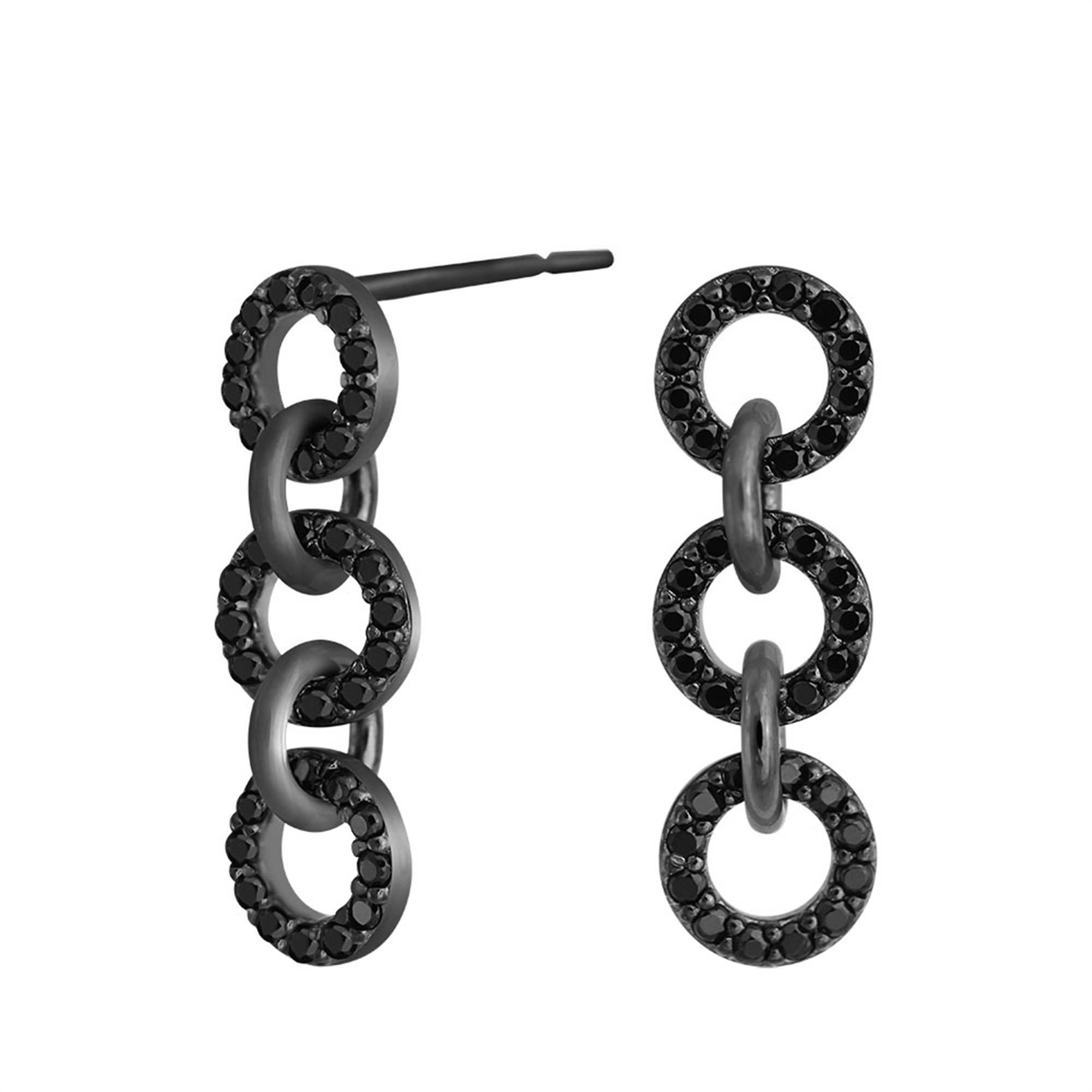 Smuk og utraditionel fortolkning af de populære cirkelsmykker. Med disse sort rhodinerede sølvørestikker fra vores DinaNor serie får du en helt ny vinkel på cirkelsmykker. Ørestikkerne består af tre cirkler besat med kubisk zirkonia, der holdes s