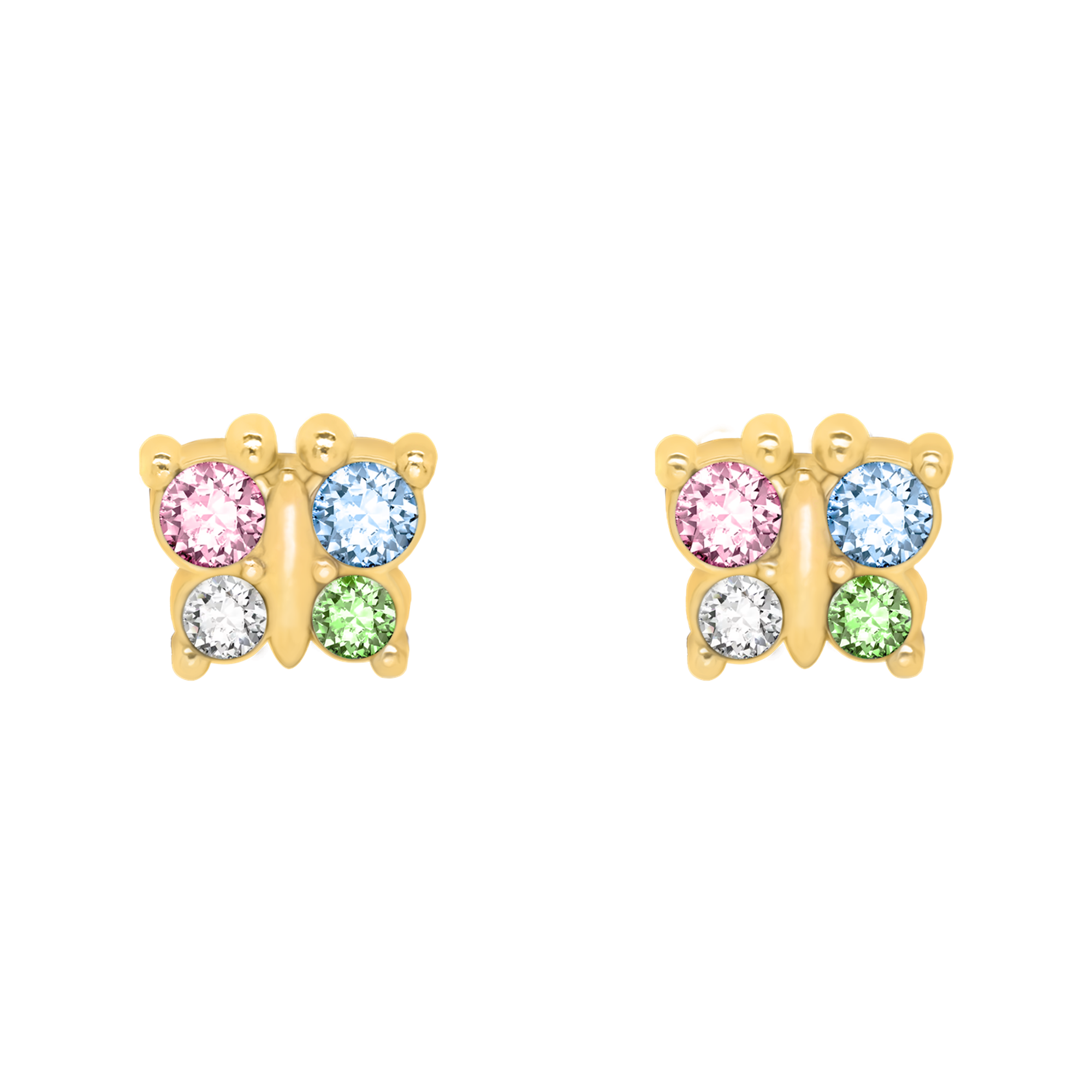 Fjärilsformade örhängen med rosa, blå, vita och gröna stenar, symmetriskt placerade.