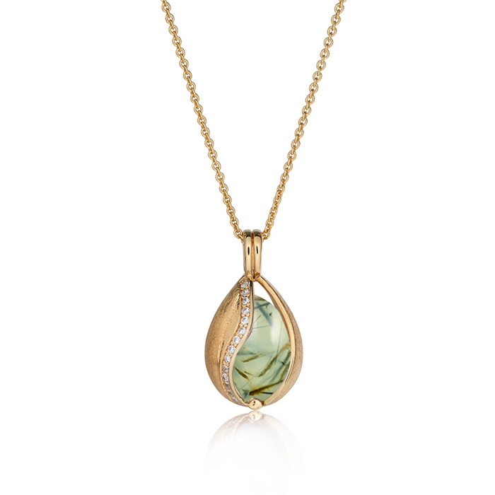 Stort forgyldt smykke æg, Prehnit - Blicher Fuglsang, med 70-80 cm justerbar kæde