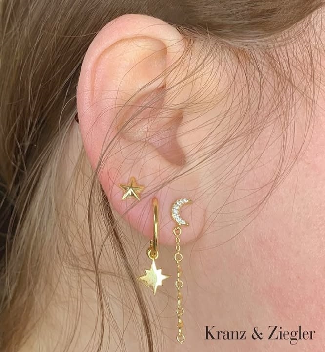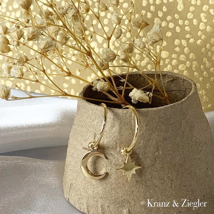 Fina och förgyllda creoler i öppen design med hängen som visar en halvmåne och en vacker ledstjärna
