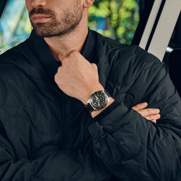 Den tydliga urtavlan gör det enkelt att läsa av tiden även under intensiv träning. Det svarta läderbandet ger en bekväm passform under långa resor, och den robusta konstruktionen passar lika bra på vandringen som i vardagen.