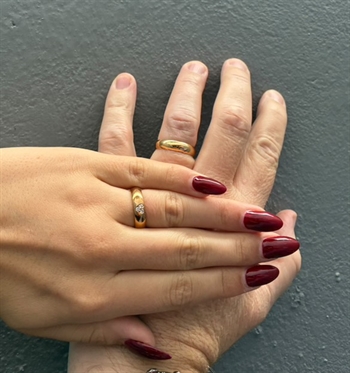 The rings have a romantic rounded look, and in the lady's ring are three pcs 0,03 ct climate friendly diamonds set in grab setting, like an elegant heart